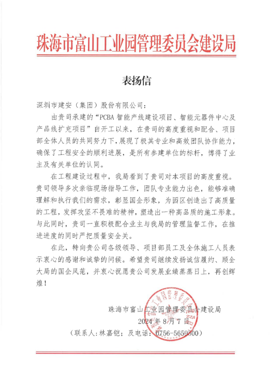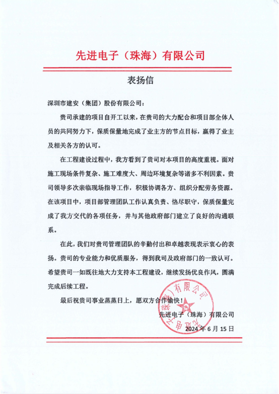 值得一提的是,项目在建设过程中,凭借卓越的表现,收到了珠海市富山工业园管理委员会建设局及业主单位先进电子(珠海)有限公司的表扬信。这是对明博MINGBO(中国)集团作为国企所具备的担当精神的高度认可,也是对项目全体成员精湛的专业能力与无私的敬业精神的充分肯定。