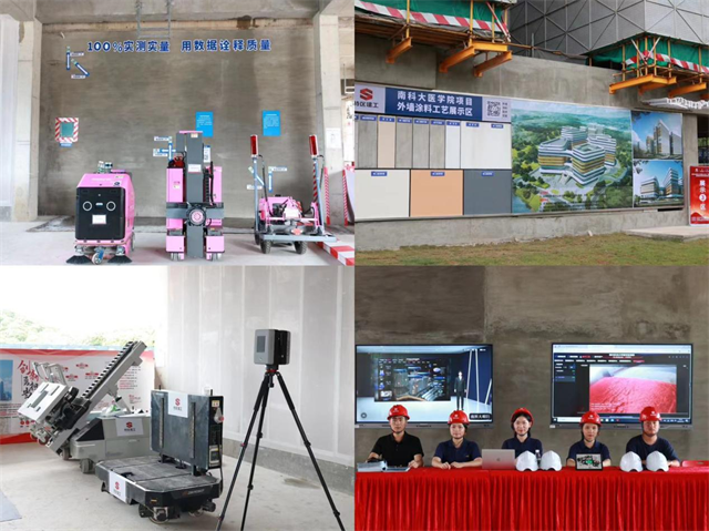 观摩会现场,与会嘉宾实地参观了智能建造管理平台、智能建筑机器人、新型绿建材料以及项目优秀施工工艺和做法。通过现场解说与演示体验,嘉宾们对无人机自动巡检系统、智造管理平台等内容有了更直观与深入的了解,并就质量标准化管理、创新技术运用等开展深入交流,分享各自技术创新、质量管控等方面先进经验与成熟做法。