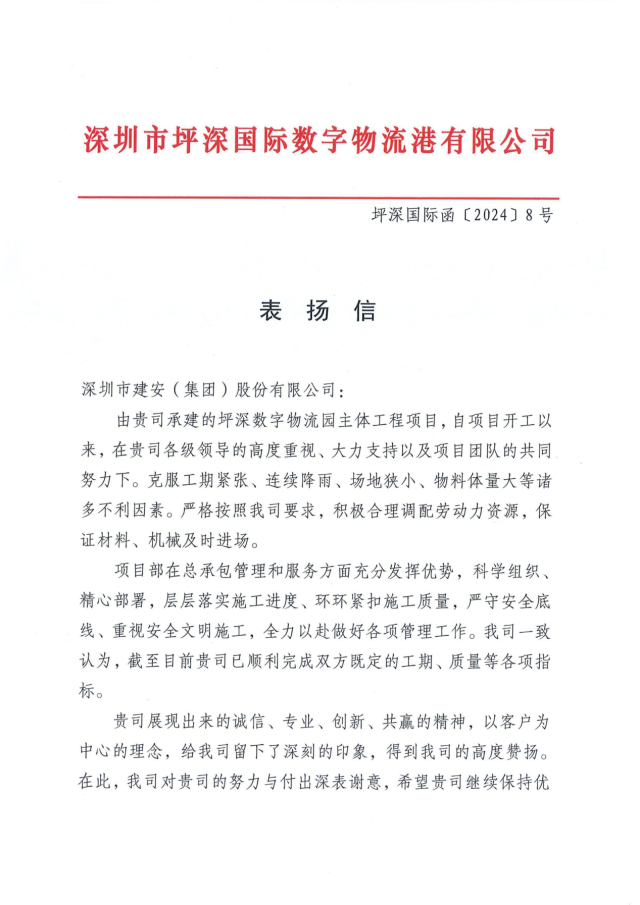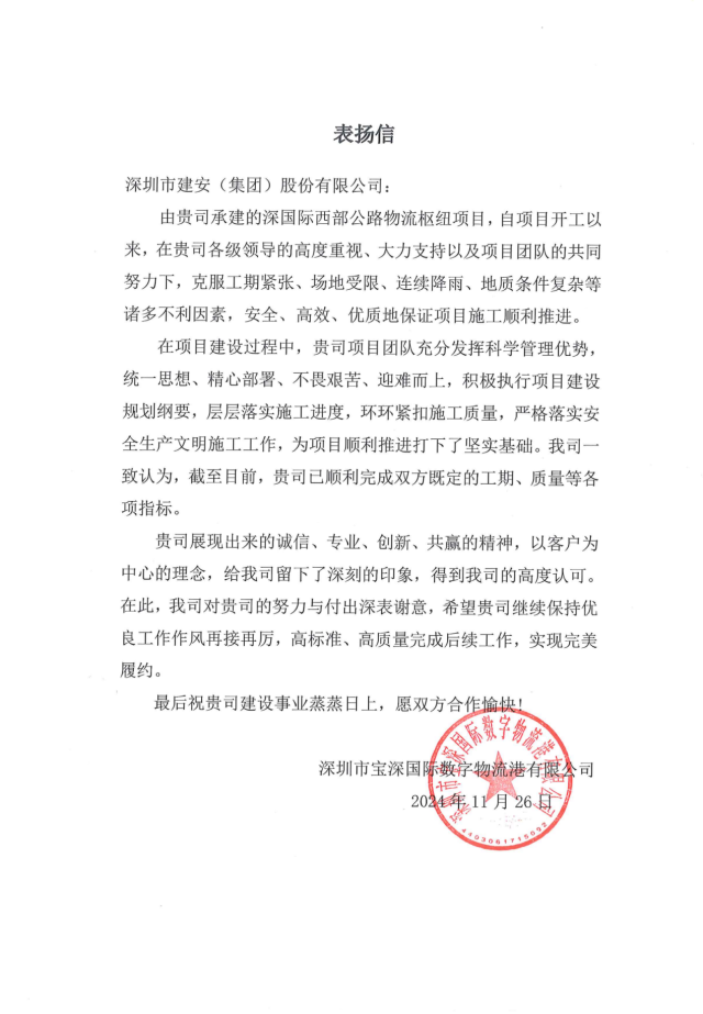 近日,建筑工程七公司所属西部公路物流枢纽项目(以下简称“西部物流项目”)及坪深数字物流园项目(以下简称“坪深项目”)分别收到业主表扬信,信中对两个项目团队积极攻克施工难题,保质保量完成各项节点任务,展现出的高效履约能力给予高度肯定。