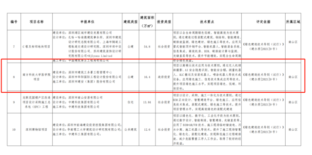 2024年12月18日,深圳市住房和建设局公布了深圳市绿色建造试点项目名单,南方科技大学医学院项目以其“争当表率、提质增绿”的绿色建造理念和实践成功入选。