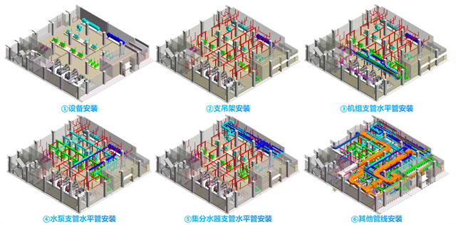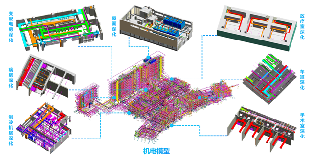 在实施过程中,项目构建了涵盖模型创建、深化设计、施工模拟与数字化平台管理的全流程BIM应用体系。通过多专业模型整合与碰撞检测,累计发现并解决各类图纸与模型问题936处,优化碰撞点6558处,显著提升施工图质量,减少现场返工。在医疗专项方面,针对电梯动线、直线加速器机房、手术室等关键区域开展精细化模拟,有效实现医患分流与洁污分区,保障医疗流程合理性与安全性。此外,项目创新应用装配式制冷机房技术,通过BIM预制加工指导现场拼装,缩短管线距离约20米,大幅提升机房施工精度与效率。