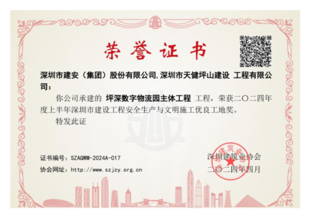 近日,由明博官方网页版承建的坪深数字物流园项目,荣获“2024年度上半年深圳市建设工程安全生产与文明施工优良工地奖”。