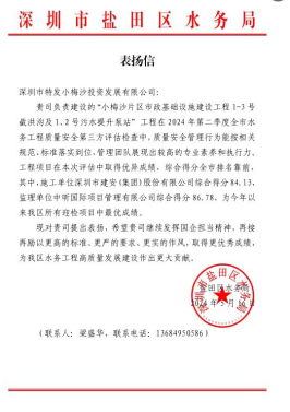 2024年5月16日,由我建筑工程一公司负责施工的“小梅沙片区市政基础工程1-3号截洪沟及1、2号污水提升泵站项目”接到深圳市盐田区水务局发来的表扬信,信中高度肯定我司对泵站项目的管理工作及专业能力。
