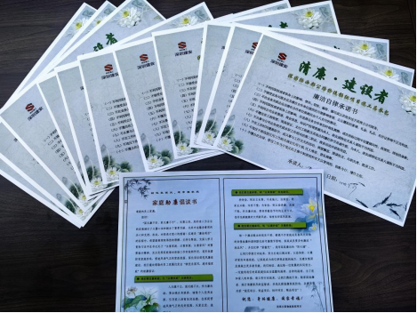 最后,全体人员怀着敬畏之心,郑重在《廉洁自律承诺书》上签字。项目部还向全体成员发出“树优良家风,建幸福家庭”的家庭廉洁倡议书,建立与员工家属监督互动、廉洁互助机制。希望家庭成员多吹廉洁“枕边风”,多念纪律“紧箍咒”,筑牢家庭廉洁的“防火墙”,共同营造廉洁的家庭氛围。