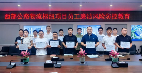 为进一步强化员工廉洁从业意识,筑牢拒腐防变思想防线,2024年5月27日下午,西部公路物流枢纽项目组织全体管理人员开展员工廉洁风险防控教育活动。此次活动聚焦项目廉洁风险高发易发管理环节,通过对员工廉洁风险防控措施的宣贯,上好项目廉洁建设第一课。