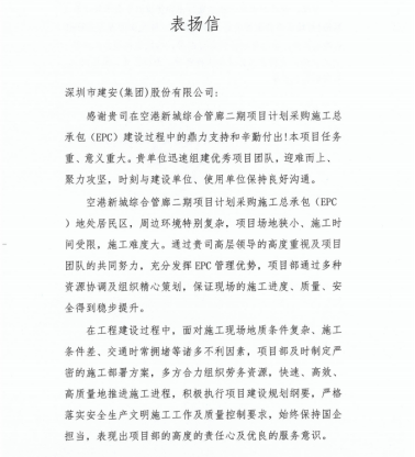 2024年6月3日,由市政工程公司承建的空港新城综合管廊二期项目收到业主单位深圳中冶管廊科技发展有限公司的表扬信。
