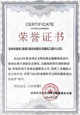 近日,建筑工程六公司荣获龙岗区文明办颁发的“2023年度新时代文明实践优秀合作伙伴”称号。