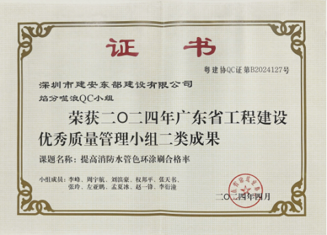 与此同时,焰分噬浪QC小组也凭借课题《提高消防水管色环涂刷合格率》获得二类成果奖项。该小组针对龙岗区宝龙街道宝龙专精特新产业园消防工程项目中的消防水管色环涂刷合格率问题,展开深入调查和分析,找出了涂刷不整齐和着色不均匀两大症结,并制定了有效的对策措施。经过实施,消防水管色环涂刷合格率得到了显著提升,为项目的顺利进行提供了有力保障。