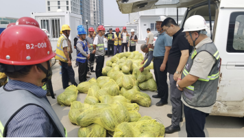 慰问活动中,皮建存一行为奋战在施工一线的工友们发放了凉茶、西瓜、防暑药品等慰问品,并与项目管理人员、工友进行面对面交流。要求项目管理人员做好夏季防暑降温工作,确保安全生产、有序施工。叮嘱工友在高温环境下作业注意自我防护,在干好工作的同时要保重身体。项目经理张洋对业主领导的到访与慰问表示欢迎和感谢,同时叮嘱工友们在现场作业中要合理安排工作时间,做到防暑降温与施工推进两不误。